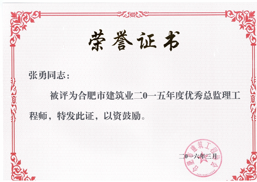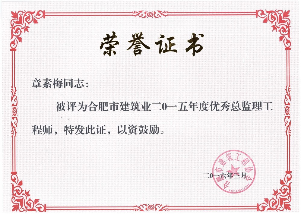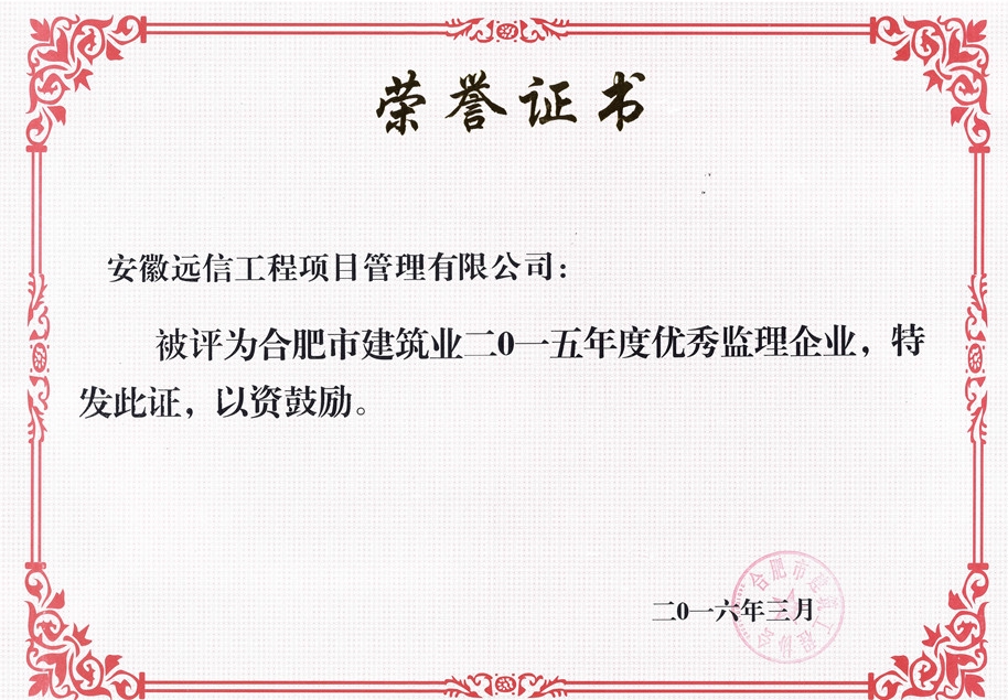近日,合肥市城鄉(xiāng)建設(shè)委員會正式發(fā)布《關(guān)于表彰全市建筑業(yè)2015年度優(yōu)秀企業(yè)、單項(xiàng)先進(jìn)企業(yè)、先進(jìn)個(gè)人的決定》,公司被評為“合肥建筑業(yè)2015年度優(yōu)秀監(jiān)理企業(yè)”,這是公司連續(xù)第三年度獲此殊榮。與此同時(shí),公司總監(jiān)張勇、趙賢禮、章素梅3人被評為“合肥建筑業(yè)2015年度優(yōu)秀總監(jiān)理工程師”。