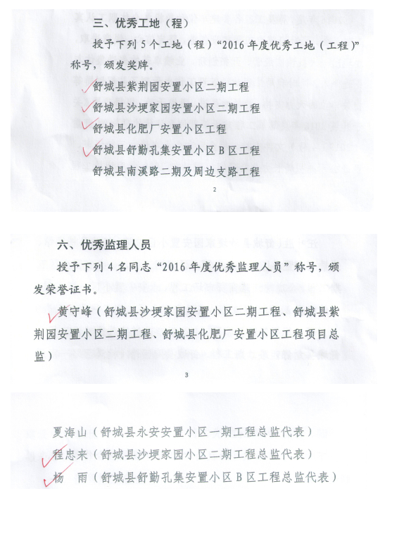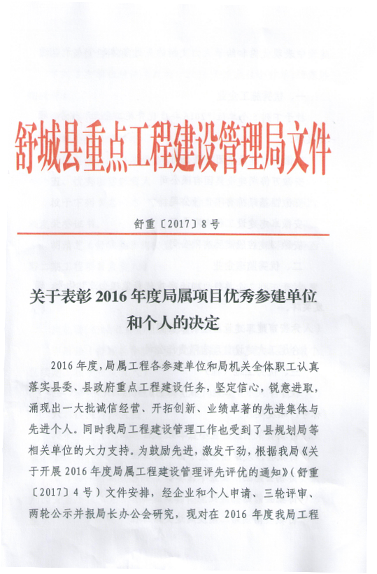 2017年2月28日,舒城縣重點局正式公布了授予“2016年度優秀工地(工程)”稱號和“2016年度優秀監理人員”稱號的獲獎名單。