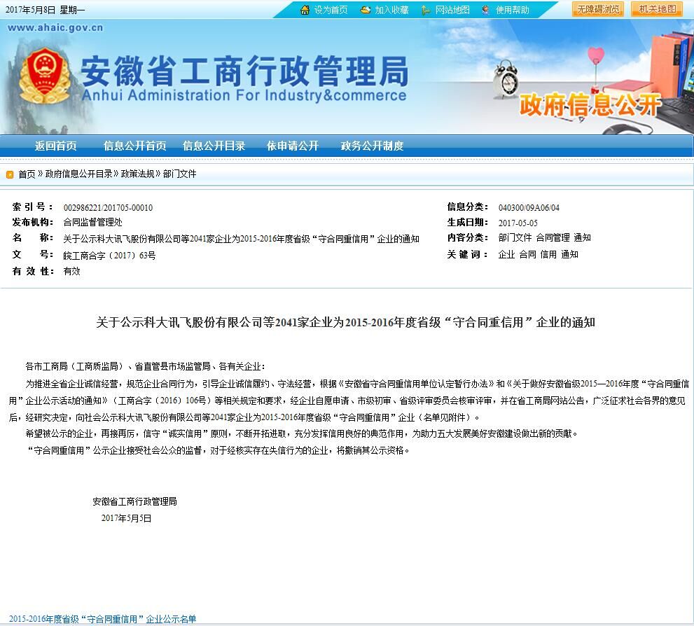 近日,安徽省工商行政管理局發布“2015-2016年度省級守合同重信用企業”公示評選結果,經企業自愿申請、市級初審、省級評審委員會核審評審,并在省工商局網站公告并廣泛征求社會各界的意見后,向社會公示2015-2016年度省級“守合同重信用”企業,我公司再次獲得該項榮譽。
