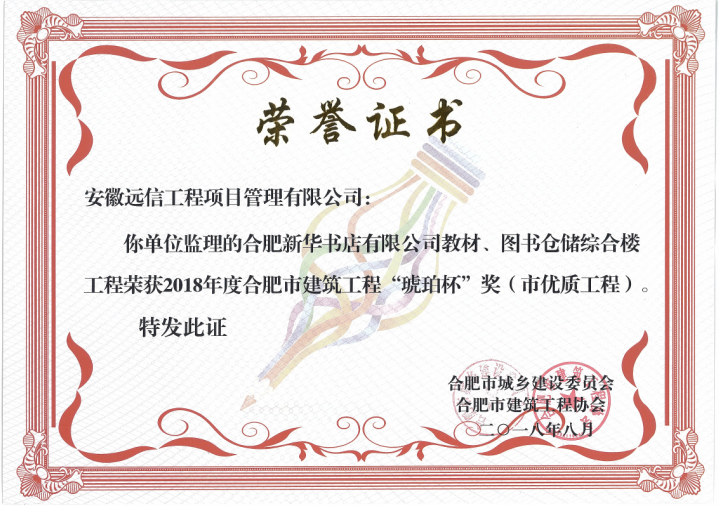 近日,合肥市城鄉建設委員會網站傳來喜訊,我公司監理的合肥新華書店有限公司教材、圖書倉儲綜合樓工程榮獲2018年度合肥市建筑工程“琥珀杯”獎(市優工程)。