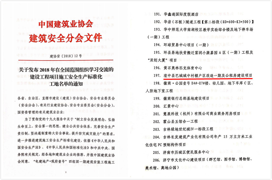 近日,從中國建筑業協會傳來捷報,由安徽遠信監理的青海省湟中縣巴城城中村棚戶區改造一期及公租房建設項目被中國建筑業協會授予2018年“建設工程項目施工安全生產標準化建設工地”稱號,并列入全國組織學習交流的建設工程項目名單。