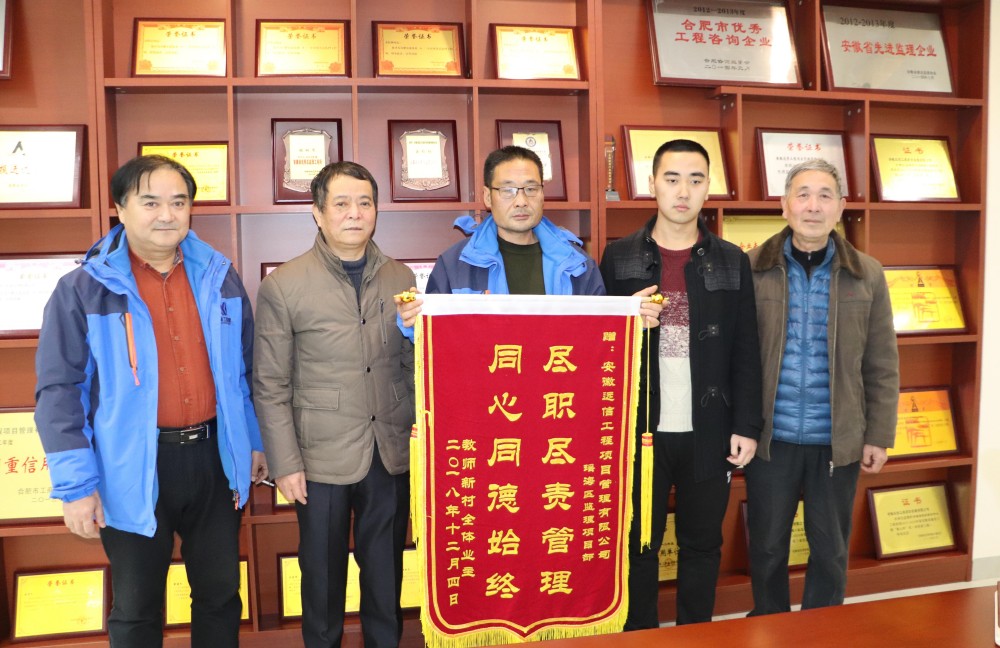 12月24日下午,教師新村的兩位業(yè)主代表、振凱園林公司代表專程來到安徽遠(yuǎn)信,將一面寫有“盡職盡責(zé)管理,同心同德始終”的錦旗交于公司常務(wù)副總兼總工郝傳山的手中,再三感謝公司在教師新村環(huán)境綜合整治項(xiàng)目監(jiān)理工作中盡職盡責(zé)的專業(yè)表現(xiàn)。隨后,郝總與代表們進(jìn)行了親切交談。