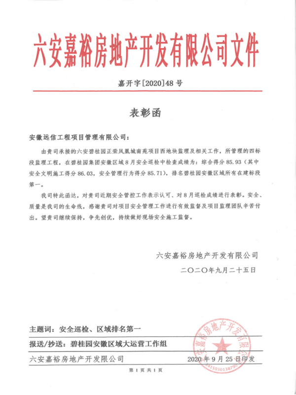 近日,在碧桂園集團(tuán)安徽區(qū)域公司開(kāi)展的8月安全巡檢評(píng)比活動(dòng)中,由安徽遠(yuǎn)信監(jiān)理的六安碧桂園正榮鳳凰城南苑項(xiàng)目以突出的質(zhì)量、安全管理工作成效,位列碧桂園安徽區(qū)域所有在建標(biāo)段評(píng)比第一名。