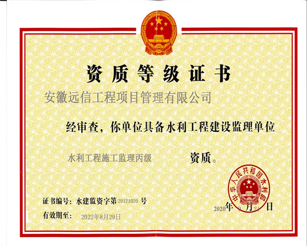 近日,經中華人民共和國水利部核準,安徽遠信通過吸收合并蚌埠明德建設監理有限公司,成功取得水利工程施工監理專業丙級資質。根據《水利工程建設監理單位資質管理辦法》規定,可承攬Ⅲ等(堤防3級)以下各等級水利工程的施工監理業務。