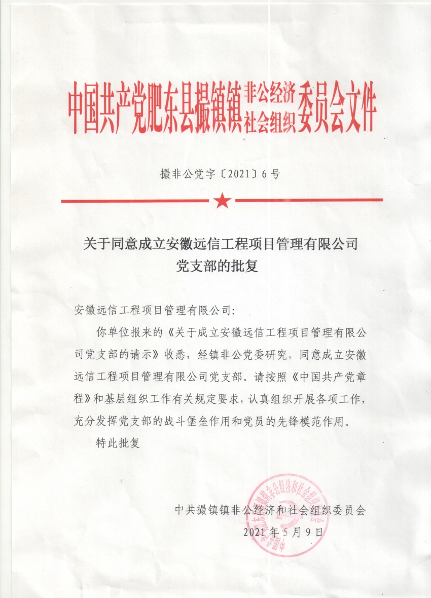 在喜迎黨的100周年華誕之際,也迎來了安徽遠信工程項目管理有限公司黨支部的成立。大會在上級黨委組織撮鎮鎮非公經濟和社會組織委員會的關心支持下順利召開。公司領導和全體黨員一同見證了這一重要時刻。