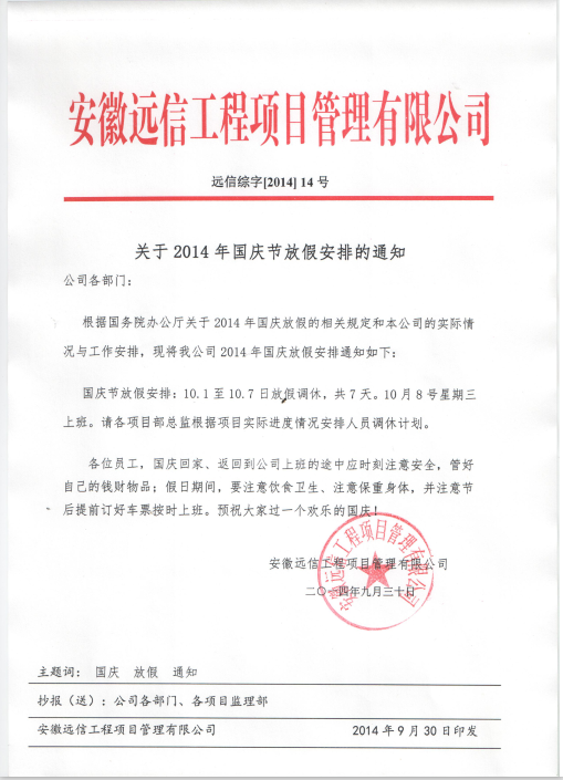 關于2014年國慶節放假安排的通知