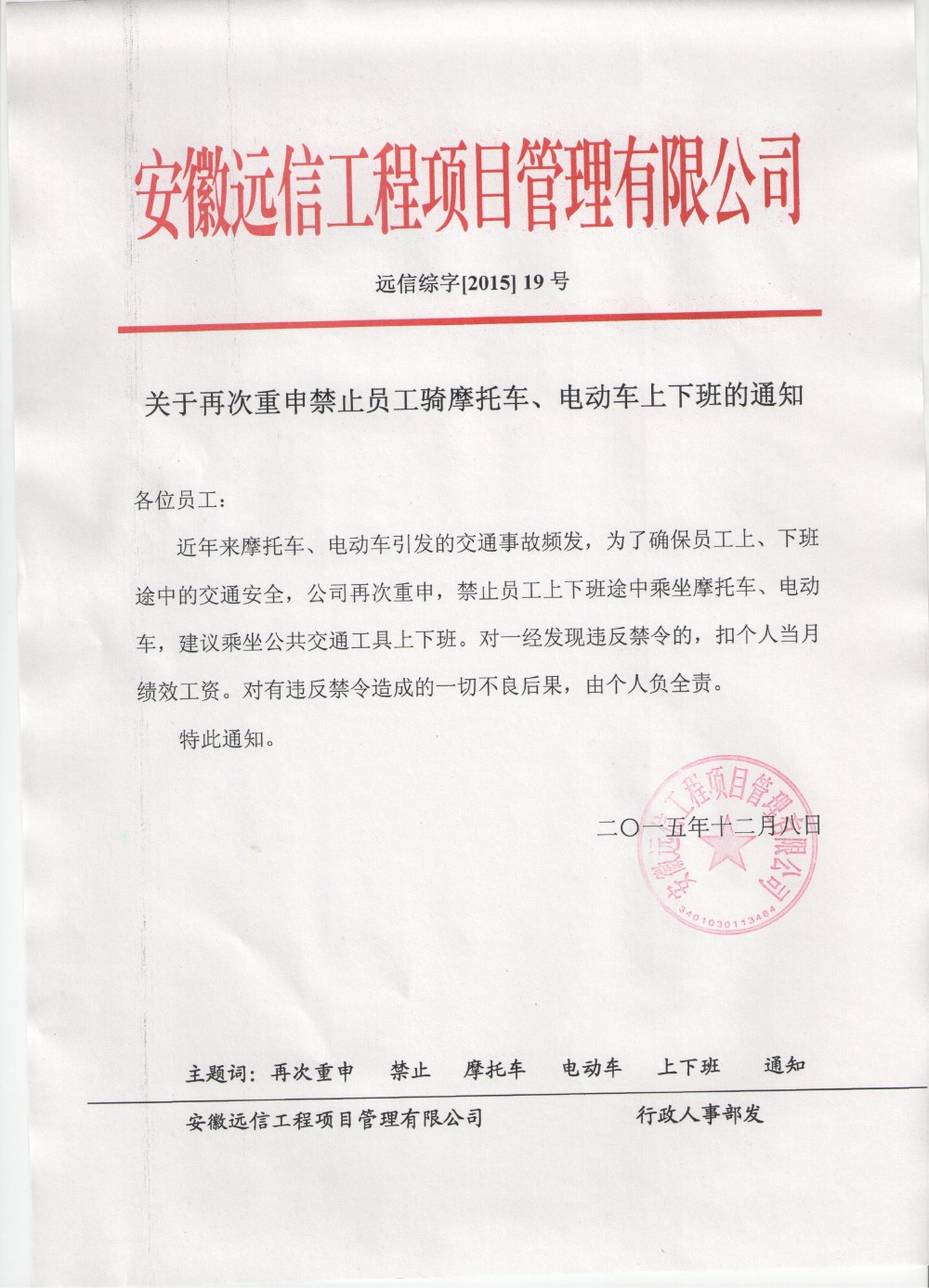 關于再次重申禁止員工騎摩托車、電動車上下班的通知