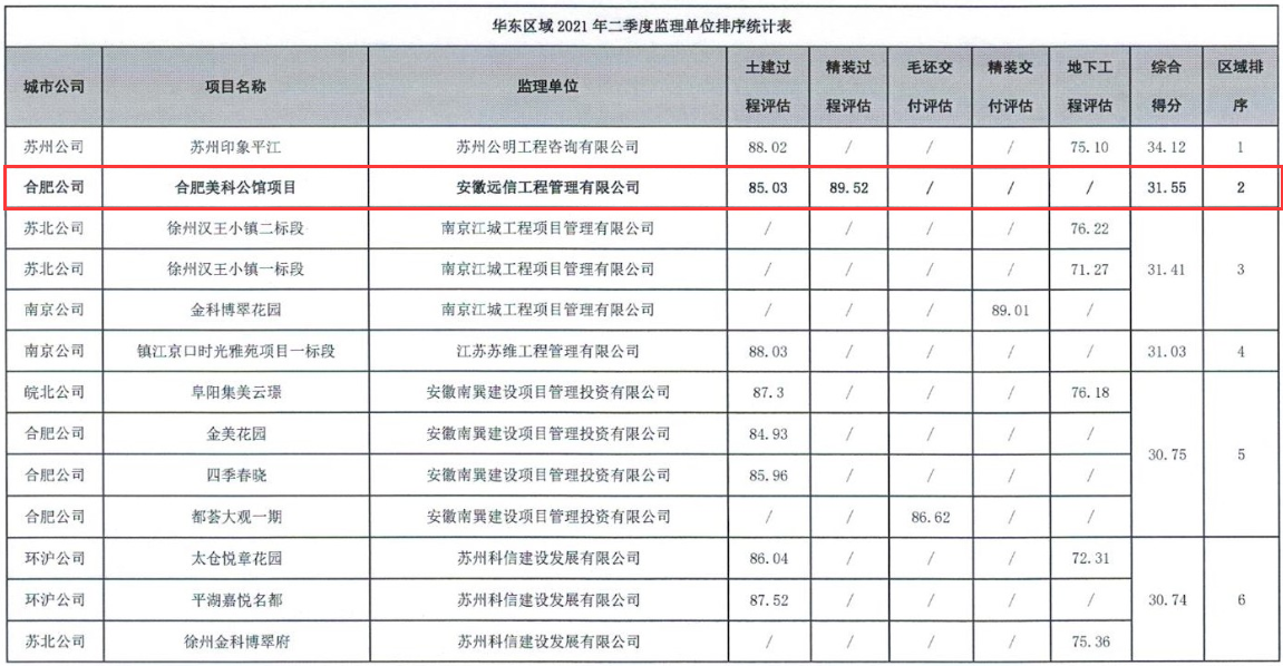 品質(zhì)守望,嚴(yán)把質(zhì)量。近日,金科股份集團(tuán)華東區(qū)域2021年二季度監(jiān)理單位排序統(tǒng)計(jì)表出爐。安徽遠(yuǎn)信工程項(xiàng)目管理有限公司位列金科地產(chǎn)華東區(qū)域公司監(jiān)理單位綜合排序第二名。